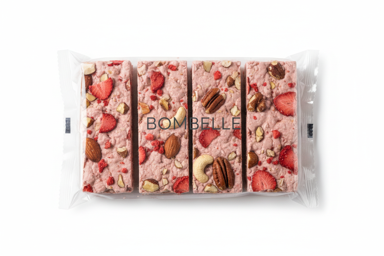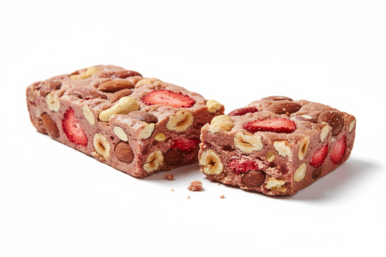 Fruktig och krispig bar med frystorkade jordgubbar, nötter och pink collagen. Lätt söt och perfekt för ett hälsosamt mellanmål.