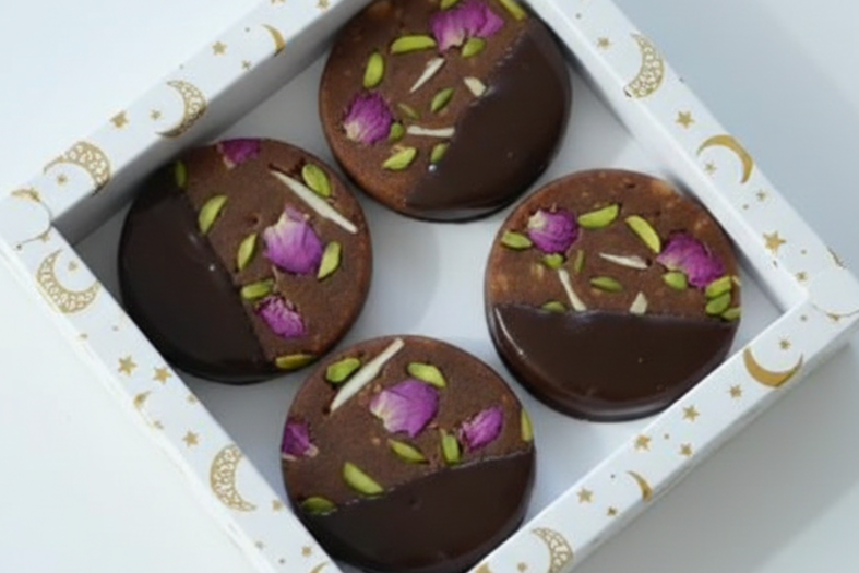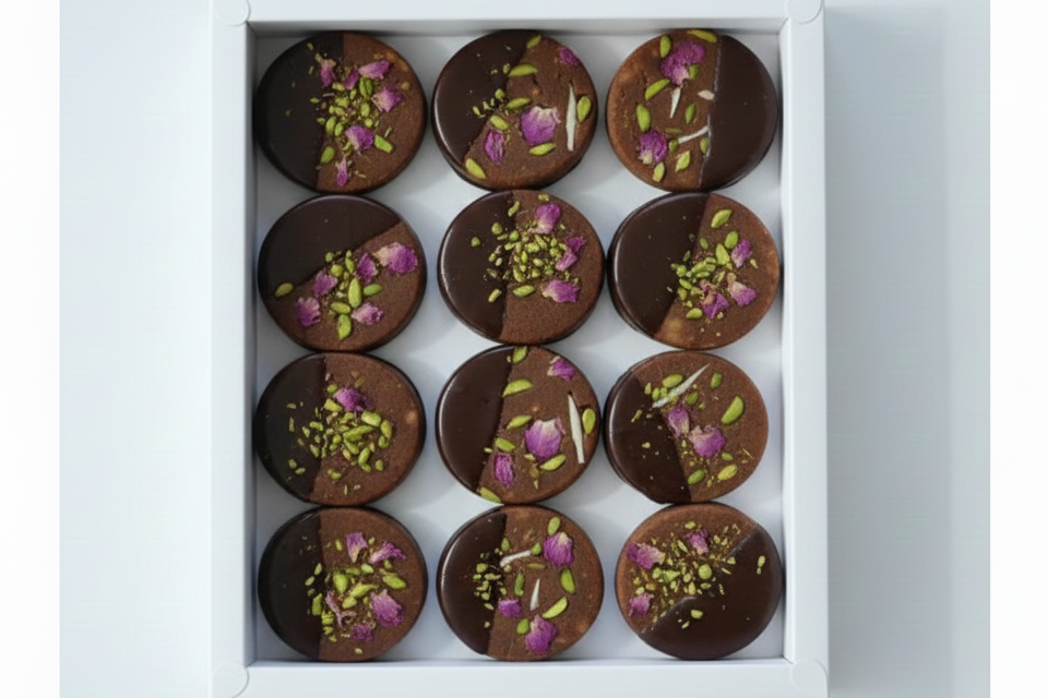 Handrullade bites av mjuk dadelmassa, omslutna av rik mörk choklad och toppade med krispig pistage samt delikata blomblad. En harmonisk kombination av naturlig sötma, djup kakao och subtil nötighet.