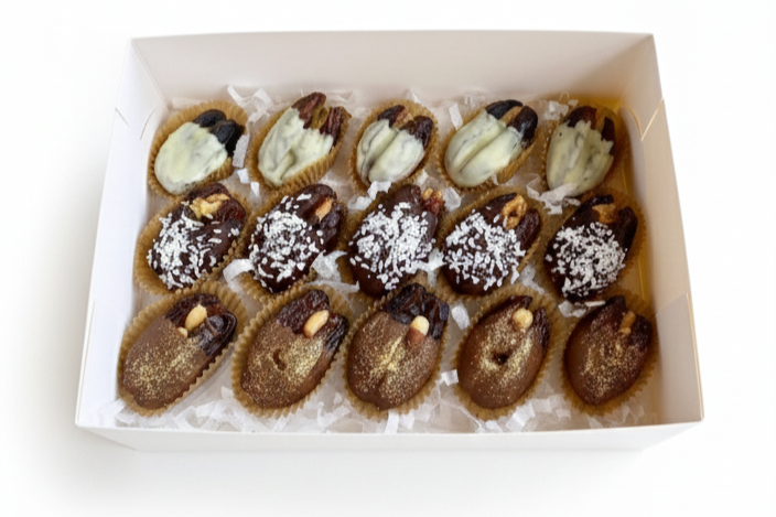 En harmonisk samling fyllda dadlar med naturlig sötma och noggrant utvalda toppings. Här möts krämiga fyllningar, rostade nötter och subtil choklad i en balanserad kombination av smak och näring.