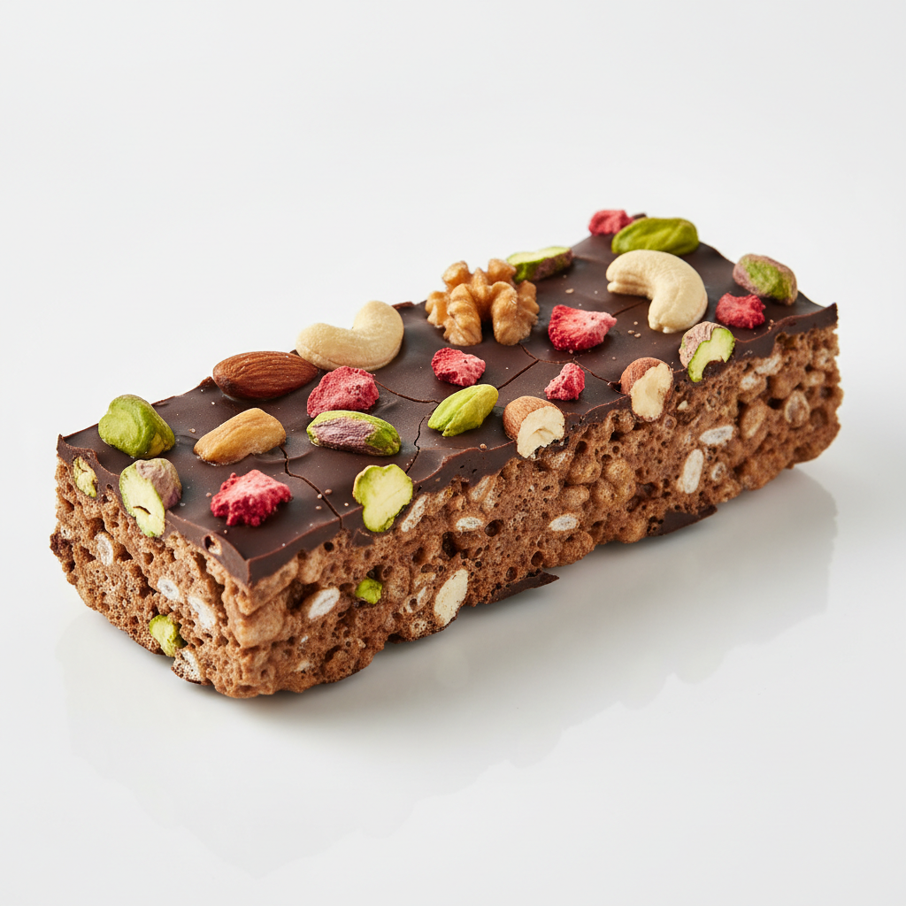 Rik och nötig bar med kakao och pistage, tillsammans med nötter och sockerfri marsmello. Smakrik med djup chokladton, perfekt för chokladälskaren.