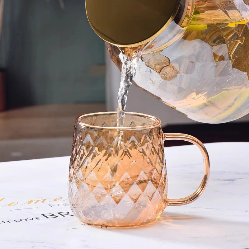 2/4pcs Diamond Textured Glass Cup Set Golden Teacup Mug With Handle Household Fruit Tea Coffee Milk Drinkware Cup Set 380ml
