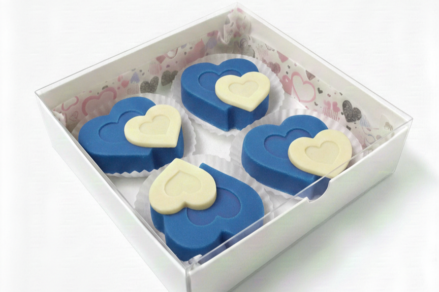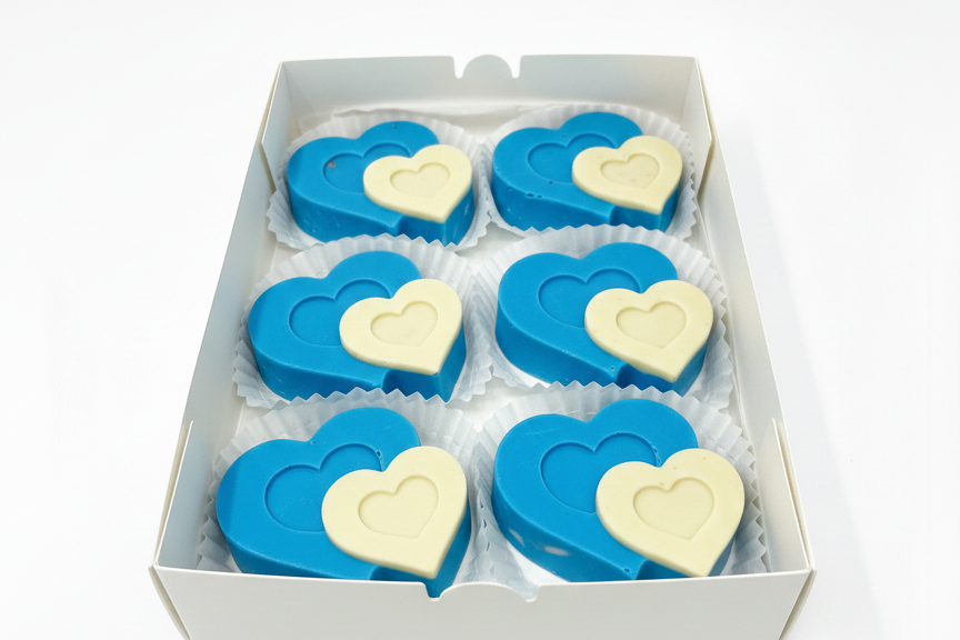 Dubbel hjärtformad choklad i blå och vit design, handgjord med fokus på både smak och estetik. Under det tunna chokladskalet döljer sig en len och smakrik blåbärsganache med naturlig bärighet, vars friska syra balanseras av en mjuk tårtbotten i mitten. Kombinationen ger en harmonisk textur med kontrast mellan krämigt, saftigt och lätt bakat. En elegant choklad som passar lika bra som gåva som till en lyxig stund för dig själv.