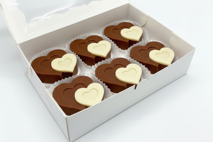 Dubbel hjärtformad choklad i mjölkchoklad och vit choklad, helt utan fyllning. En ren och elegant choklad där de två chokladsorterna möts i perfekt balans – krämig mjölkchoklad tillsammans med mild, len vit choklad. En tidlös chokladupplevelse med fokus på smak, textur och hantverk.