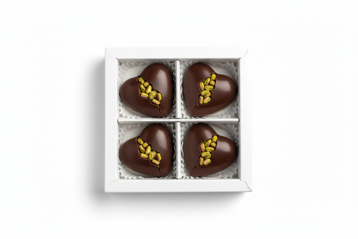 Pistachio Hearts är handgjorda hjärtformade chokladbitar med pistage, tillgängliga i en kombinerad variant av mörk och mjölkchoklad. Varje hjärta väger ca 60–65 g och bjuder på en balanserad, krämig chokladsmak med nötighet från pistagen.