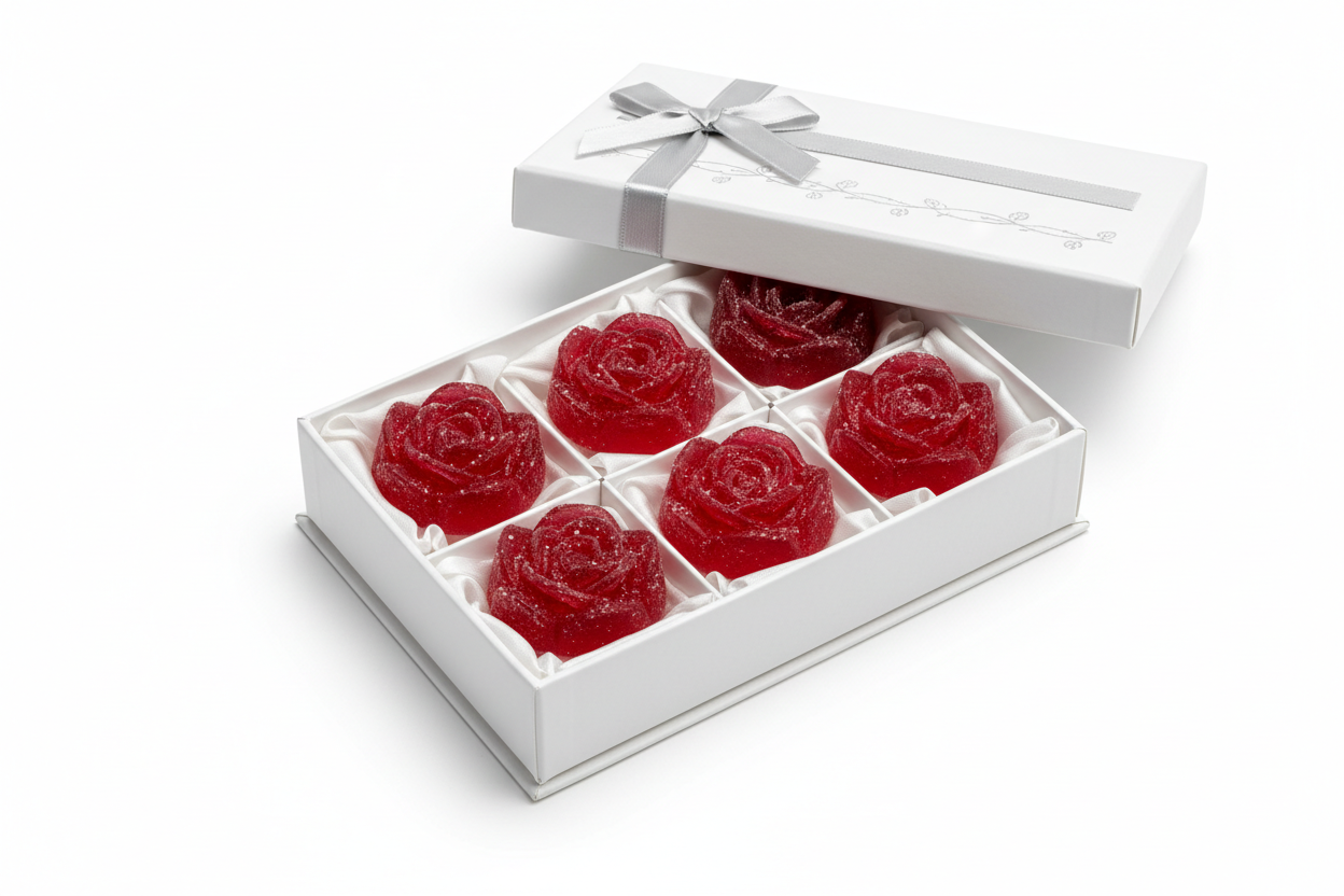 Red Crystal Roses i vacker röd nyans, skapade som exklusiva Valentine-presenter. Varje ros har en krispig kristallstruktur och en mild, fruktig smak, vilket gör dem både eleganta och dekorativa.